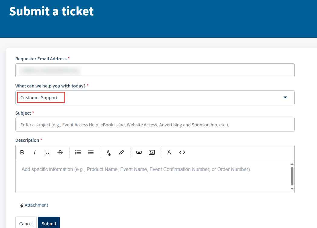 If you need information on IIA products or services, please submit a support ticket and select Customer Support from the dropdown question on the ticket form shown in the screenshot below.